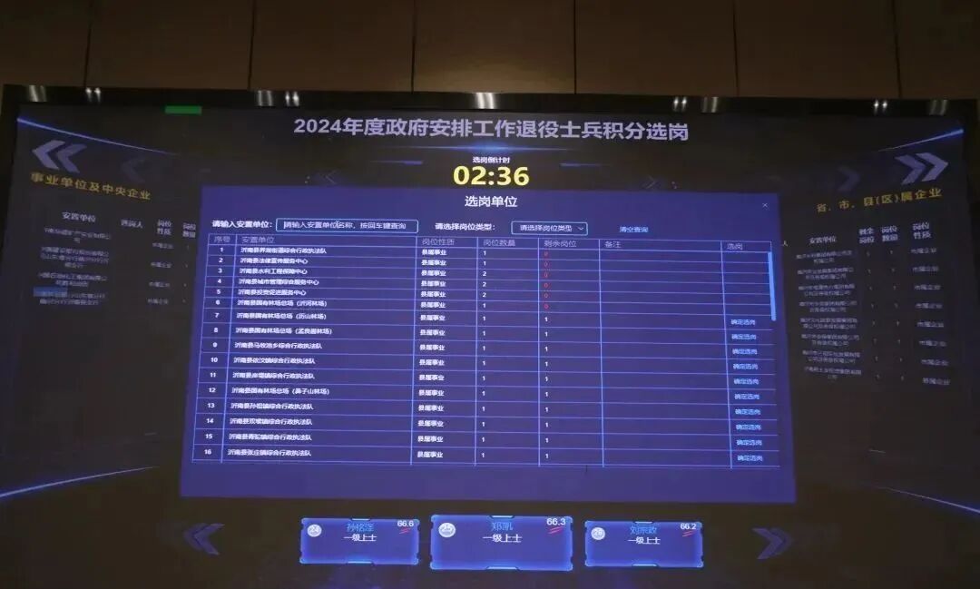 小编了解到,自去年以来,山东省沂南县退役军人事务局作为“数质安置”服务品牌试点单位,创新打造了“数质安置一体化平台”,实现退役军士“掌上报到”,报到手续一次办好,选岗现场动态展示选岗情况。