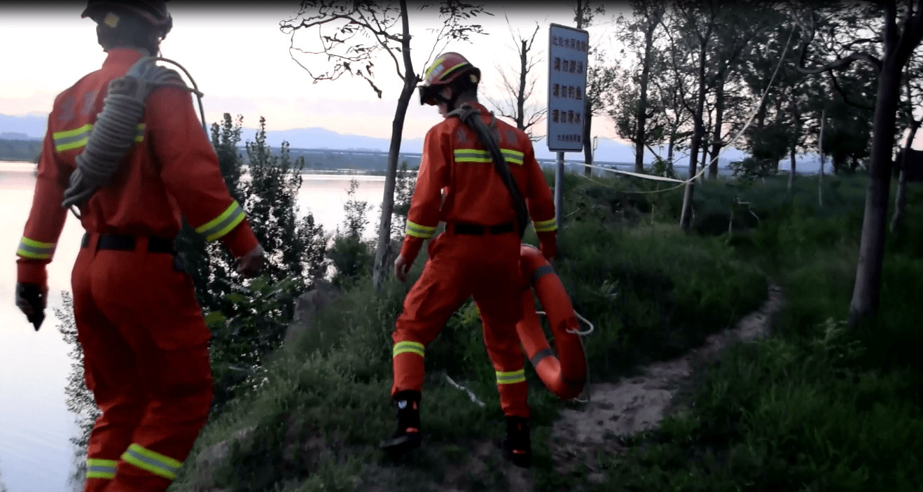 卢建介绍到:当时被困人员不能准确的描述具体位置,只能说个大概就是在河边,我们找到了当时他停车的地方,然后通过发的定位和定位共享才找到被困人员,被困人员位置距离我们停车的地方大概2公里。消防车无法通行,消防员携带救援工具器材和中暑药跑到被困人员位置。发现被困人员躺在永定河岸边处,消防指战员顺着近70度的斜坡,直线距离约20米,来到被困人员身边。先将中暑药喂给被困人员,询问其能否自行行动。得知被困人员无法行动后,消防员杨航用绳索将被困人员绑在自己身上,一根安全绳的一头绑在腰间,另一头则由在大堤上的其他消防员拉紧,往上拽,卢建在杨航身后做保护。就这样,杨航弯着腰,在安全绳的牵引下和后面人员的保护下,双手牢固的抓住身边的每一个可以利用的石头或者树木,一步一个脚印的往大堤上前行。在消防指战员共同努力下,被困人员成功被救助到安全区域。虽然直线距离只有仅仅的20米,但杨航和卢建已是满头的汗水,救援服也已湿透。