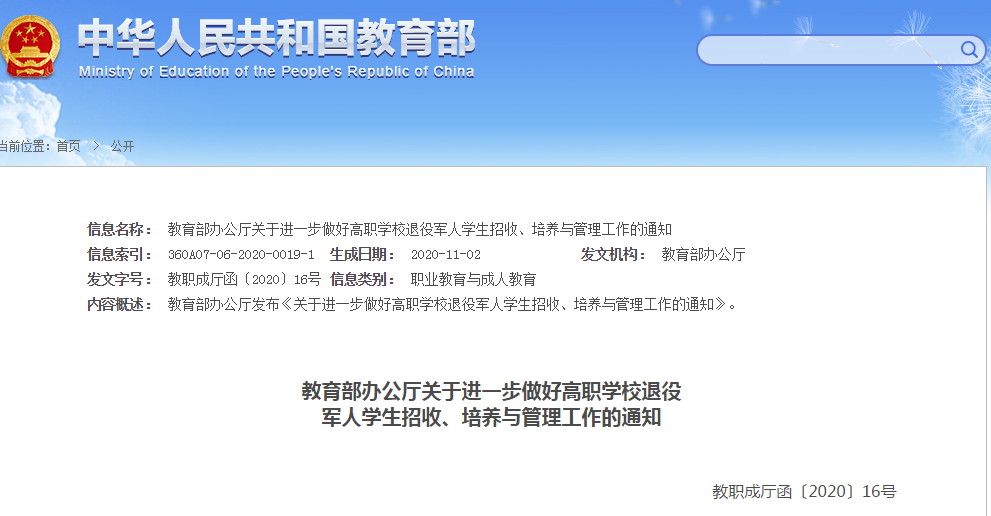 为深入贯彻落实国务院关于高职扩招和加强退役军人教育培训工作有关部署,提升退役军人技术技能水平和就业创业能力,促进其充分稳定就业,现就进一步做好高职学校退役军人学生招收、培养与管理工作通知如下。